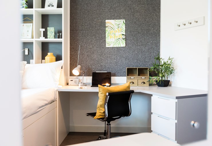 Room Size: 17 m², This room comes with a stylish kitchenette, private ensuite, double bed and lots of study & storage space. Situated on a lower floor than our Silver Studios.