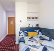 Communal kitchen and living space. Up to 5 rooms per flat Rooms accessible by lift. Double bed, wardrobe, desk and chair (Please note that bedding and other soft-furnishings are not included) Open kitchen/ living area with sofas and washing machine En-suite bathroom with shower cubicle Approximately 19.3m²