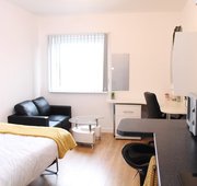 Self-contained studio with bedroom kitchen and bathroom. Floors 3-5. Situated on floors 3-5, accessible by lift Example room. Photography is for illustrative purposes, actual room may vary. Approximately 21.9m² Small Double bed Wardrobe, desk and chair, plus sofa and TV (Please note that bedding and other soft-furnishings are not included) En-suite bathroom with a shower cubicle, WC and wash basin 2 ring hob, microwave/combi-oven, fridge freezer and washer/dryer