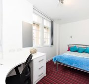 Communal kitchen and living space. Up to 3 rooms per flat Double bed, wardrobe, desk and chair (Please note that bedding and other soft-furnishings are not included) Open plan living room/ kitchen area with sofas and washer/dryer Bathroom with a shower cubicle, WC and wash basin 18.3m2 approximately