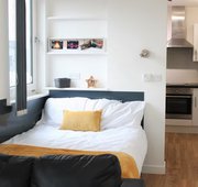Self-contained kitchen and living space. Double bed, wardrobe, desk and chair, plus a sofa and a TV set (Please note that bedding and other soft-furnishings are not included) 2 ring hob, microwave-oven, fridge freezer and washer/dryer En-suite bathroom with a shower cubicle, WC and wash basin 17.6m² approximately