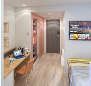 The Neo apartment is perfectly designed with student living in mind. It offers a unique studio space that is ideal for studying and relaxing, and comes complete with double bed, large flat screen TV, kitchen, desk and en-suite.