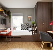 Premier studio with private kitchen and en-suite bathroom. (Range of room layouts available - images are indicative). 17.5m2 average size.