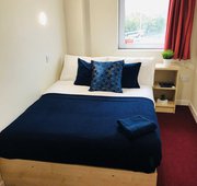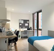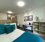 Self contained studio bedroom with own kitchen and bathroom 15-25m2 approximately Double bed Under-bed storage, desk, chair, wardrobe and chest of drawer