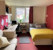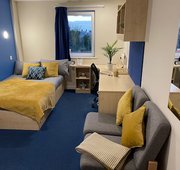 Own bathroom, kitchen and living space. 36m2 approximately Double bed En-suite shower room with toilet and basin Desk, chair, wardrobe and chest of drawers