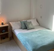Self contained studio bedroom with own kitchen and bathroom 15-18m2 approximately Double bed Under-bed storage, desk, chair, wardrobe and chest of drawers