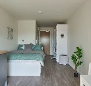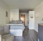 Room size of 28.4m2 - Your own private studio - Private en-suite with shower - Double bed with under bed storage - Over bed stora ge - Bedside table - Wardrobe - Chest of drawers - Study desk with shelving - Desk chair - Notice board - Coat hooks - Mirror - Your own kitchen with plenty of storage - Lounge chair / bean bag - Dining table / breakfast bar with two seats - Under counter built in oven - 4 ring hob - Integrated fridge/freezer