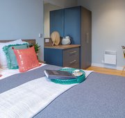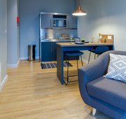 The largest of our studio apartments, this 40m² luxury student flat includes all the amazing furnishings and benefits of the Prestige Studio, in an even more spacious and airy apartment. With a generously sized bed, a bedside table, and a desk featuring built in USB sockets. The kitchen area features a combi oven, 2-ring hob, fridge/freezer, dishwasher and a dining table. The living space is kitted out with a 2-seater sofa and a 32” TV, and the study space includes a desk (with handy built in USB charging sockets) and a desk chair. A large bathroom with walk in shower completes the Prestige Accessible Studio.