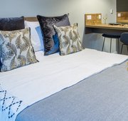 Our Premium Superior Studio has everything you’ll need to live a life of luxury whilst at university measuring 20m2. This room style features a double size bed, bedside tables, wardrobe and drawers, 32” TV, desk chair and desk with USB ports so you can have the ultimate study space at home. Along with large windows bringing in plenty of natural daylight. Within the kitchen area is all the amenities needed with a microwave/oven, induction hob, fridge/freezer and breakfast bar. This room style has a modern fully fitted en-suite with shower.