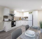 En-suite bedroom with a shared living space and kitchen 15.17m² approximately Small double bed En-suite bathroom with shower, toilet and basin Desk, chair, underbed storage and wardrobe