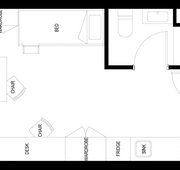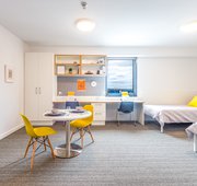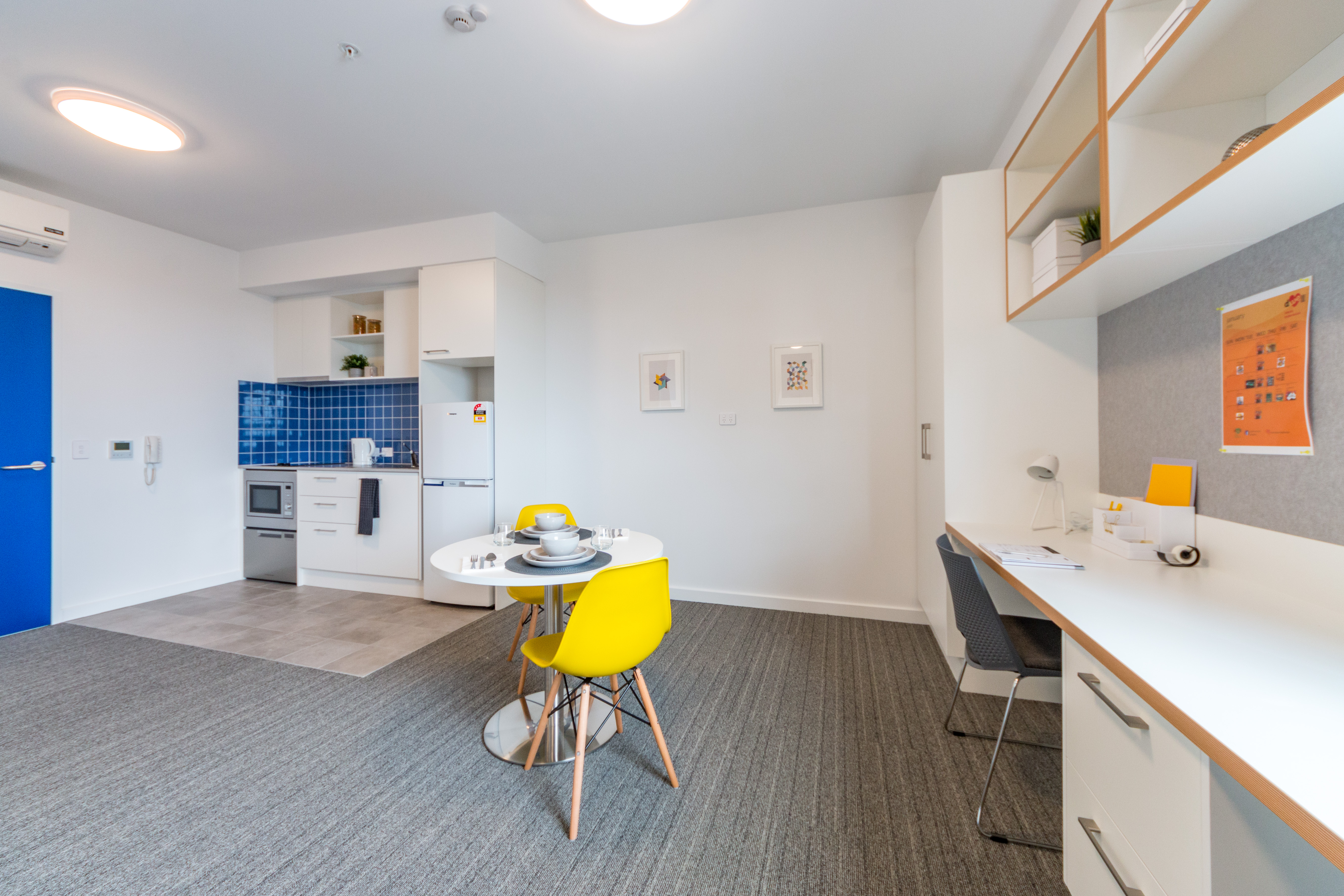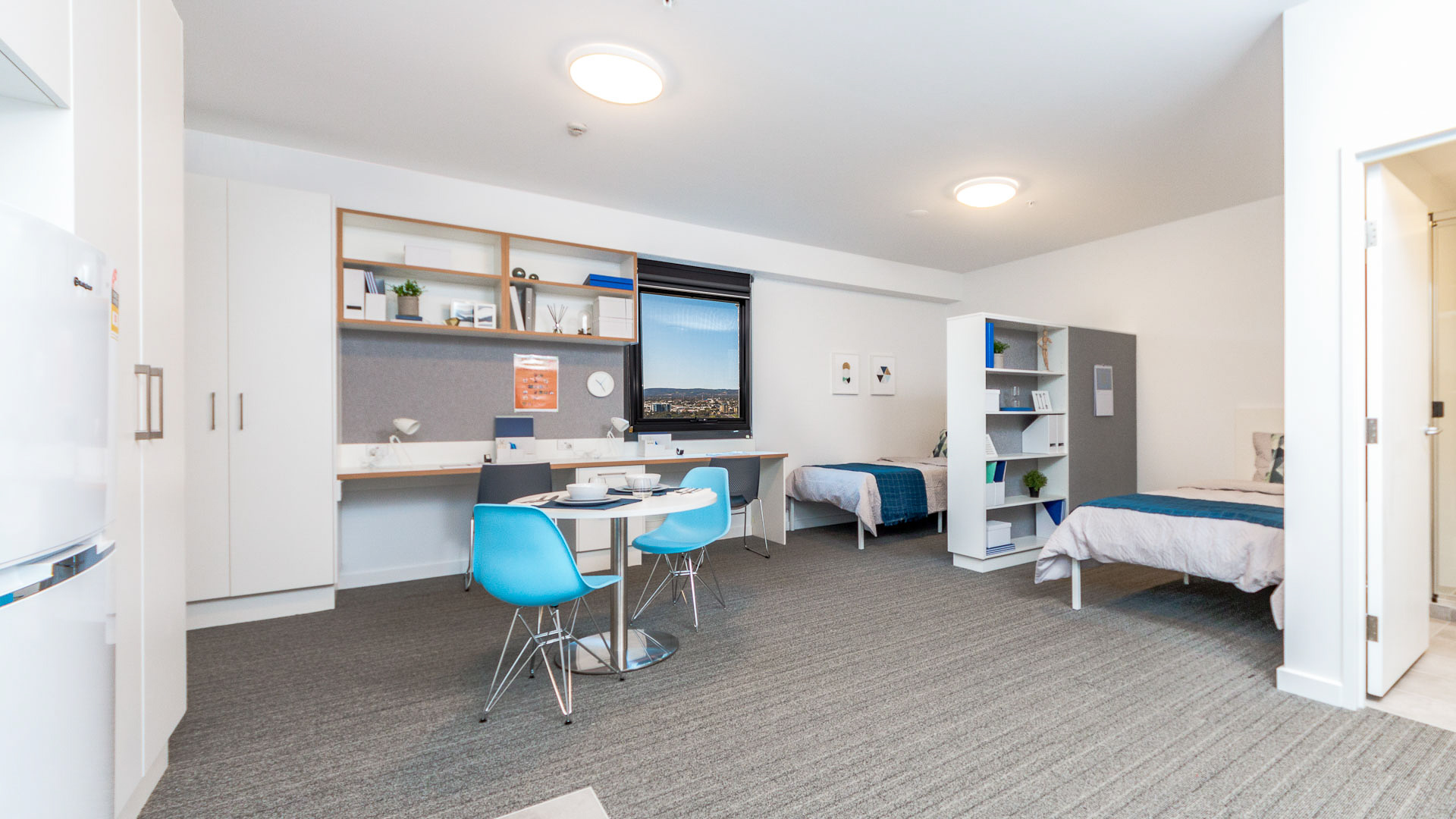 Our Deluxe Twin-Share studio apartment is approximately 38 sqm in size. Offering two comfortable King Single beds, wheelchair accessible ensuite bathroom, individual study desks, and a dining table with chairs.