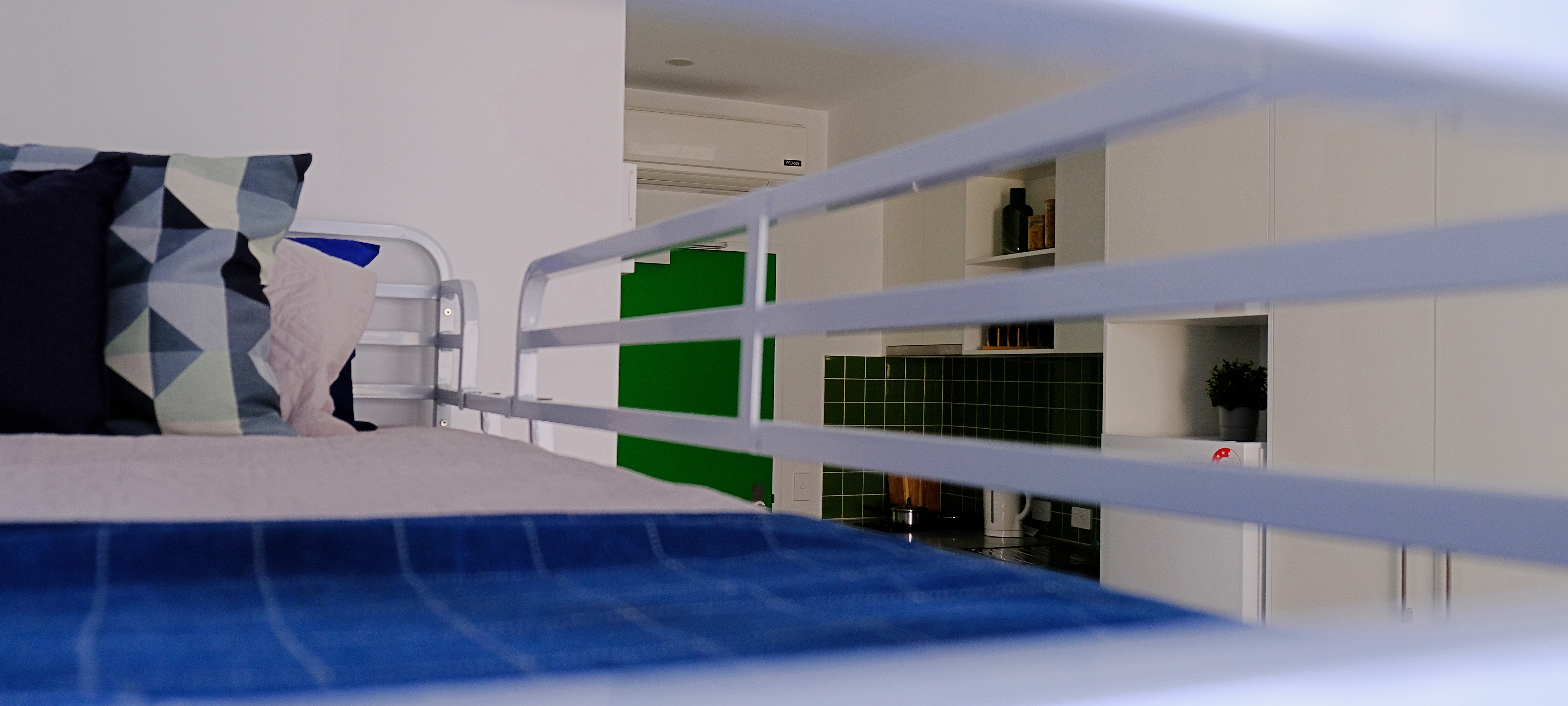 Our Twin Loft Bed Studio apartment is approximately 26 sqm in size. Offering two comfortable single beds, ensuite bathroom, and individual study desks.
