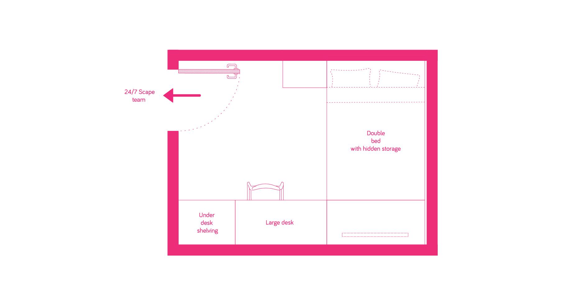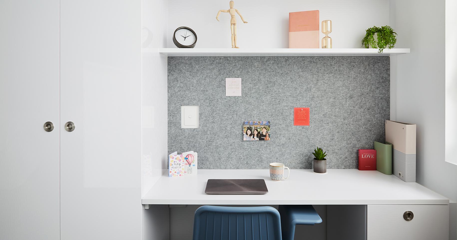 A shared kitchen, dining area, and bathroom with separate private bedrooms, each equipped with a large studio desk. Prices may vary as per the floor. The deposit amount is first week’s rent to secure the room.