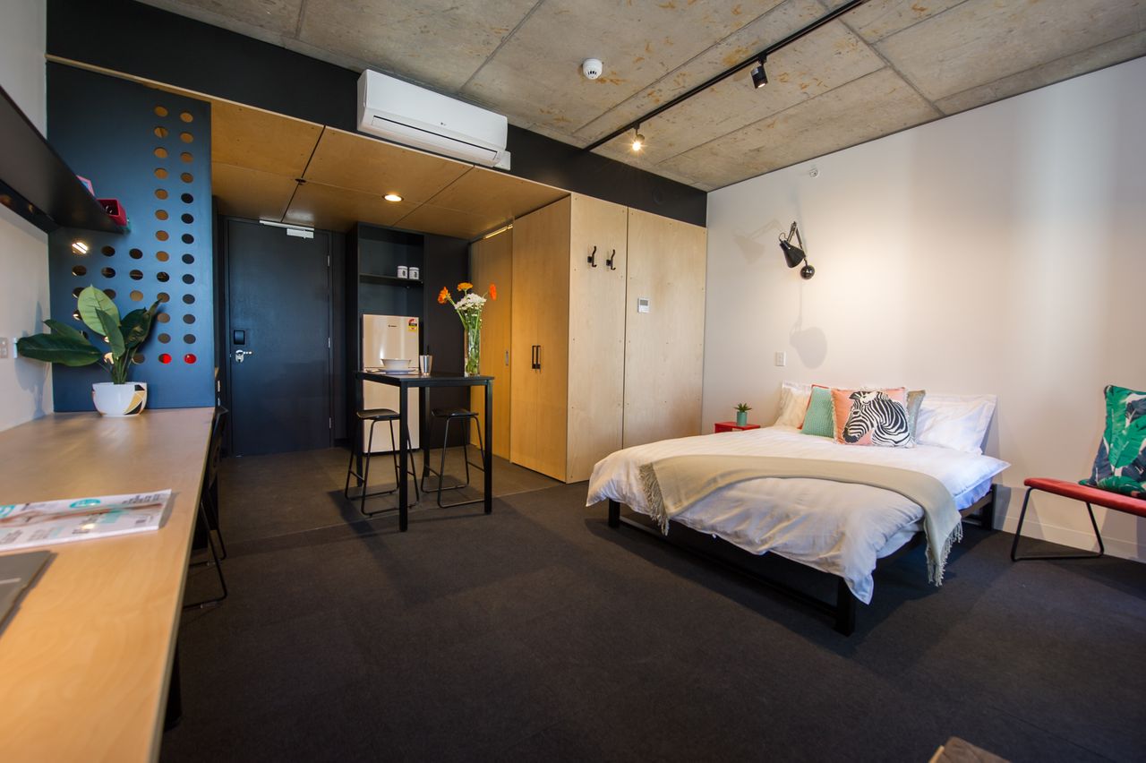 This 28sqm studio features a king single bed, generous study desk, study lamp, wardrobe, shelving and a reverse cycle air-conditioner. An overhead lamp above the bed just adds another level of comfort for some light reading or catching up on your favourite novel.