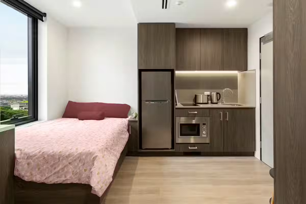 The Twin-Share Studio offers a balance of privacy and socialising, with two comfy beds, a stylish shared bathroom, dedicated study desks, a full kitchen, and dining table and chairs.