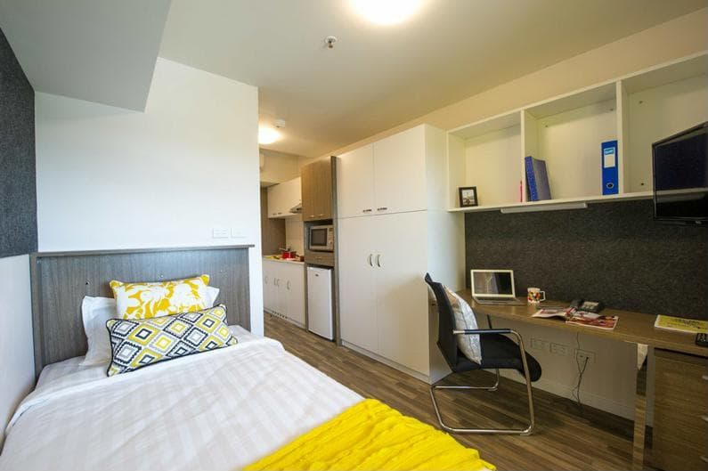 Our studio double apartments are perfect for students who have a partner. Your stylish furnished studio has a large cozy double bed, two large study desks complete with desk lamps and chairs, your own fully equipped kitchen with microwave, 113L bar fridge, a modern glass cooktop and of course, plenty of storage space. You also have a private ensuite bathroom in your unit, large flat screen TV, built-in wardrobes, a living area, and air conditioning to keep you cool during the Tropical Darwin weather. It serves all purpose that a couple would need to feel at home.