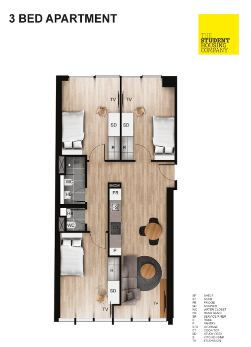 Live with friends or make new ones, and share a modern kitchen and living room in one of these 3 Bedroom apartments. These apartments are built for socializing with living space to cook, chat, study or chill with your mates. You also get to enjoy the privacy of your own bedroom and private ensuite bathroom too! * Our 3 Bed Ensuite Apartments are located on Floors 2 and 12 - 19, and are approximately 68 sq.m.*