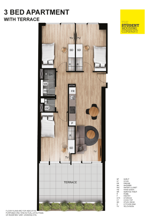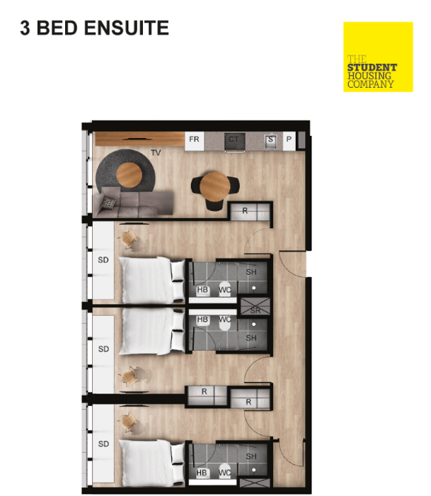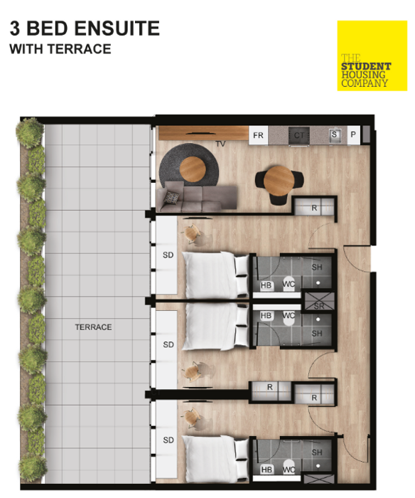 Live with friends or make new ones in one of these 3 Bed Ensuite Apartments with terraces. These apartments are built for socializing with shared living space to cook, chat, study or chill with your mates. You get to enjoy the privacy of your own bedroom and private ensuite bathroom. Plus the apartment features an epic outdoor terrace, for enjoying the sun with friends! * Our 3 Bed Ensuite Apartments with terraces are located on Floors 1 and 11 and are approximately 68 sq.m. *