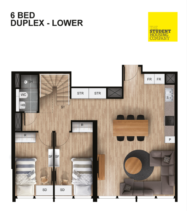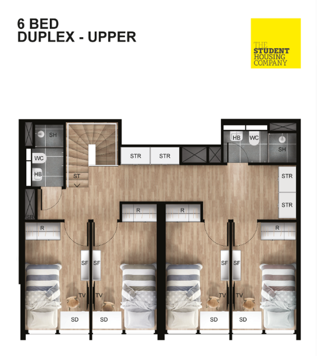 When it comes to value for money and WOW factor, this is the room type for you. The 6 Bedroom Apartment is over two levels and you still have your own space in a well designed bedroom, a stylish and fully equipped kitchen and living area shared with 5 other students. Plus of course you are still benefiting from all of the great features that come with living at Yugo Berkeley Street at a value price. These apartments are located on Floors 12 to 19. The average size of our 6 Bed Apartments is approximately 128 sq.m.