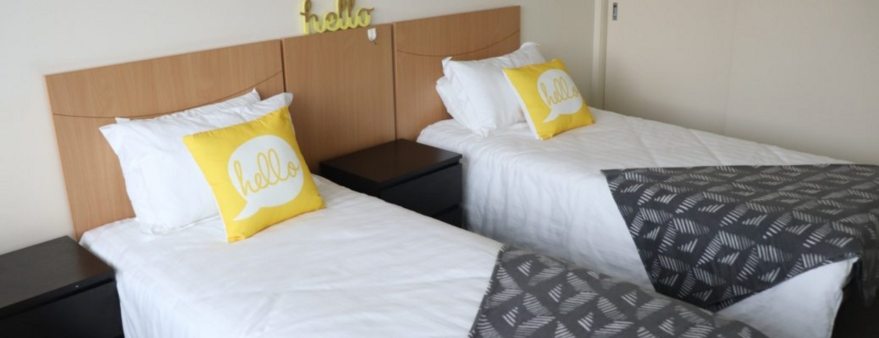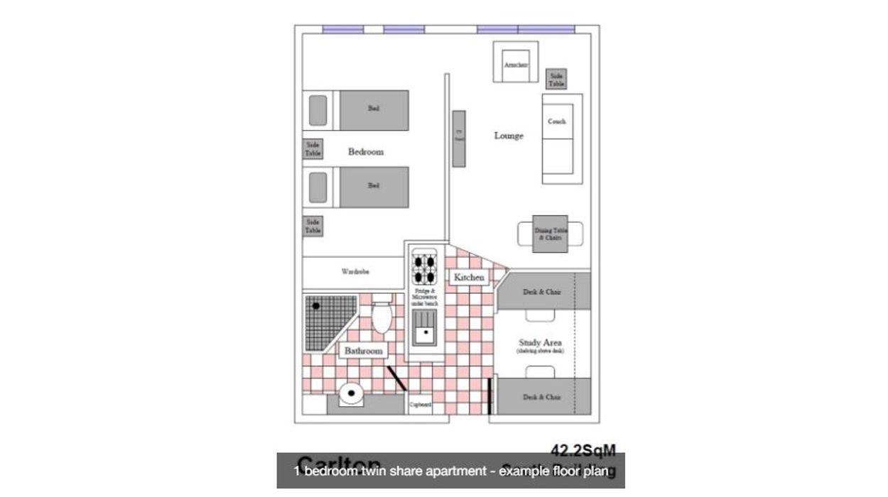 Positioned in a large room separate from the living and kitchen area, this The 1 Bedroom Twin Share Apartment is perfect for students to share with their best mates or to make a new best mate. The apartment has a fully equipped kitchen with plenty of storage to stock away your favourite condiments.