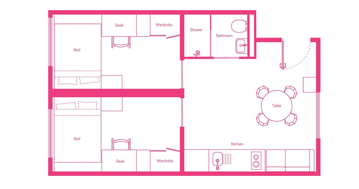 Comes with a shared kitchen, dining area, living room and bathroom with separate private bedrooms, each equipped with a double bed and study area. Basic information : Shared bathroom Approx. 7.69m² Double bed (approx. 138cm*188cm) Shared kitchen 1 bed in your room Facilities in this room : Air Conditioning, Bathroom, Chairs, Closet, Desk, Door Lock, Heating, Kitchen, Television, WiFi.