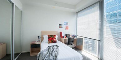 Fully furnished 2 bedroom apartments with single beds, study desks and bathroom, 32” TV and two seater sofa. The apartment has a fully equipped kitchen with modern appliances fridge and microwave. Other features include reverse cycle air-conditioning and heating. High Levels between 10-23. Rent Includes: Contents Insurance Additional Fees & Extras not Included in Rent: Internet Departure Cleaning Fee Water Usage Electricity – Connect with “On the Move Cooking Utensils, Cutlery & Dinner ware Bed Linen & Towels Small Appliances – Kettle & Toaster Community Spirit Program Membership