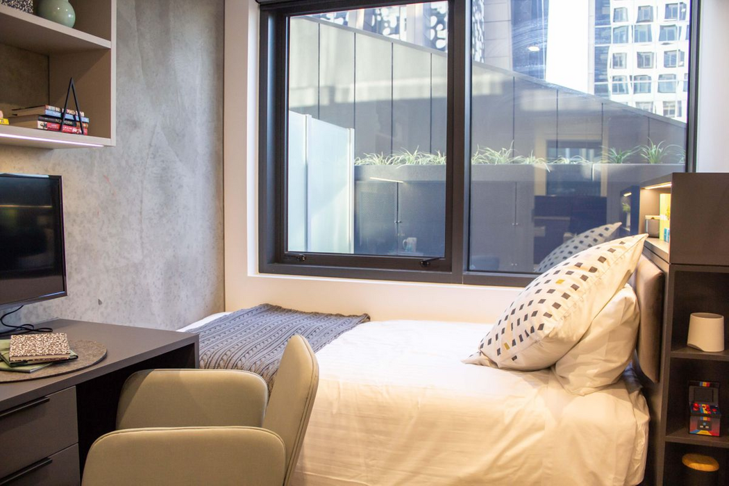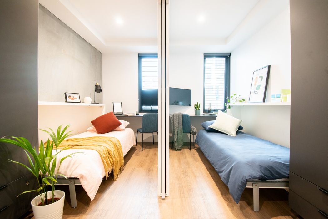 If you love the sound of our studios with all the high spec features but are looking to save a little on the cost, how about sharing a studio room with a friend or maybe make a new friend? Our twin studios are well designed to maximize privacy with a separate ensuite bathroom. When the full height sliding walls are opened up and bed folded up the room is converted into a large fully furnished living area with kitchen, great for chilling during the day. The average size of our Twin Studios is approximately 26 sq.m. * Available on floors 1-2 *