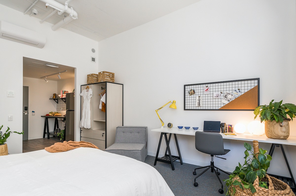 Room Size: 15 sqm. Our Studios are just what you’re looking for. Boasting your own bathroom and kitchen, this sweet space also comes with a comfy double-size bed, plenty of storage and a built-in desk with a view.