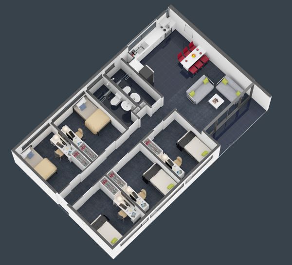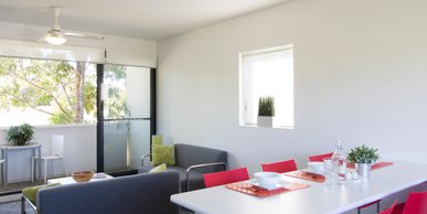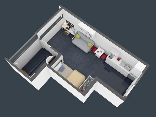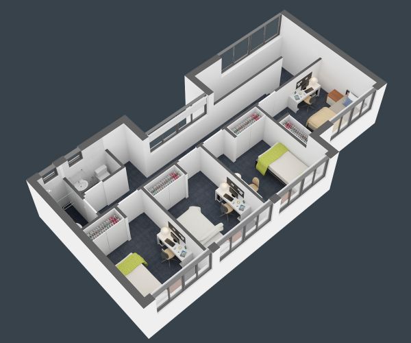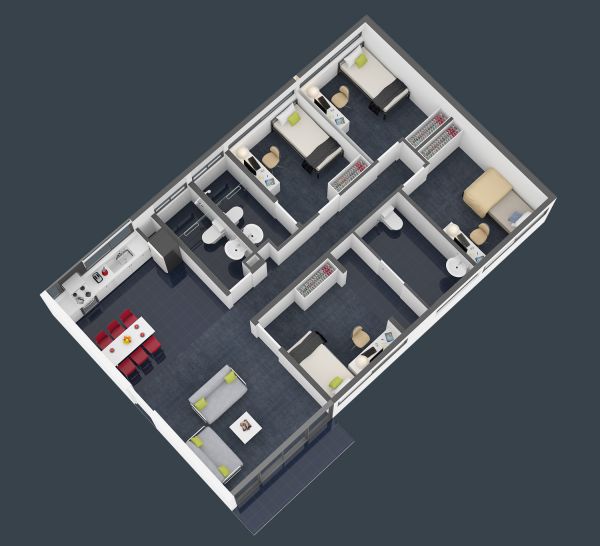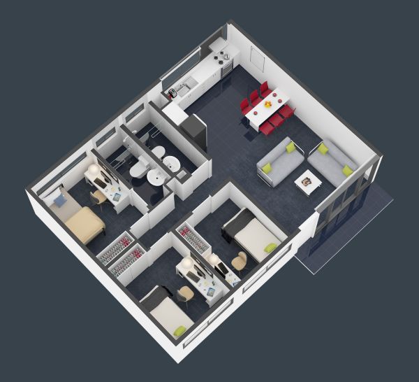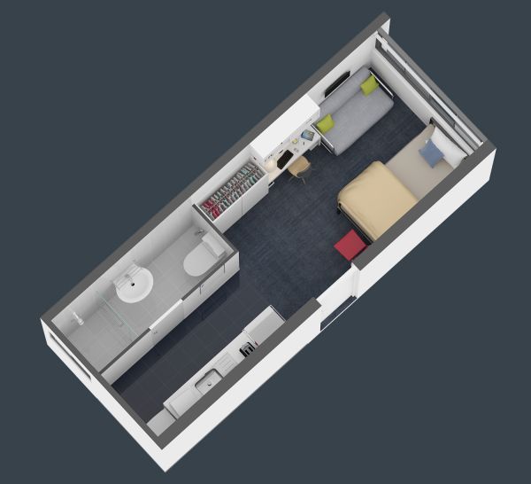 King single bed (Twin Room has 2x King Single) Study desk and chair Wardrobe Fan Heater Lounge suite with coffee table TV Dining table and chairs Two shared bathrooms Microwave Cook-top, oven and range hood Refrigerator and freezer Waste bin Housekeeping equipment (broom, mop, bucket) Outdoor balcony University WiFi included