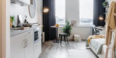 Find your personal space in the biggest shared accommodation in town: Live the way you like in your private studio with your own kitchen and ensuite bathroom. (Sample illustration!)