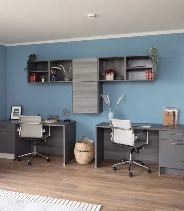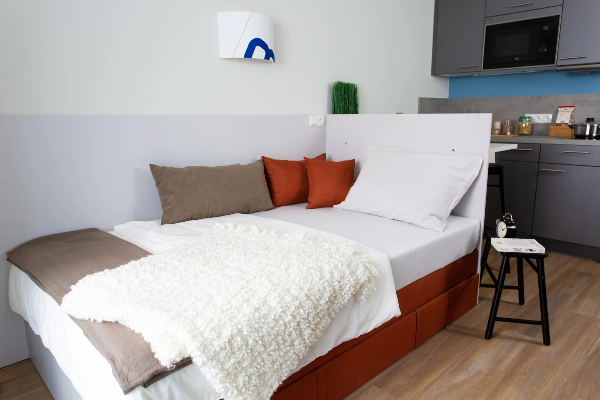 This double studio is equipped with double bed, work space, open kitchen, and ensuite bathroom. It is perfect for two, or anyone preferring more space on their own. (Sample illustration!)