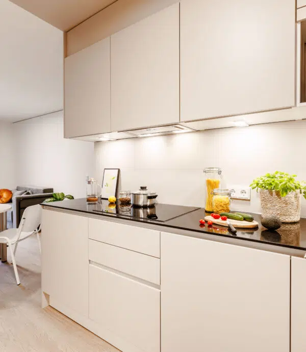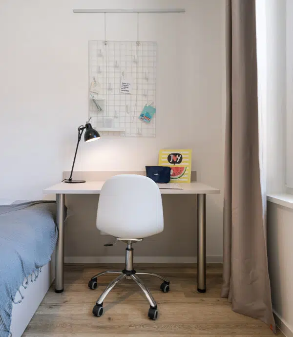 The double studio is equipped with a double bed, work area, open kitchen and private bathroom. It’s perfect for two or everyone who likes to have a little more space for themselves. (Sample illustration!)