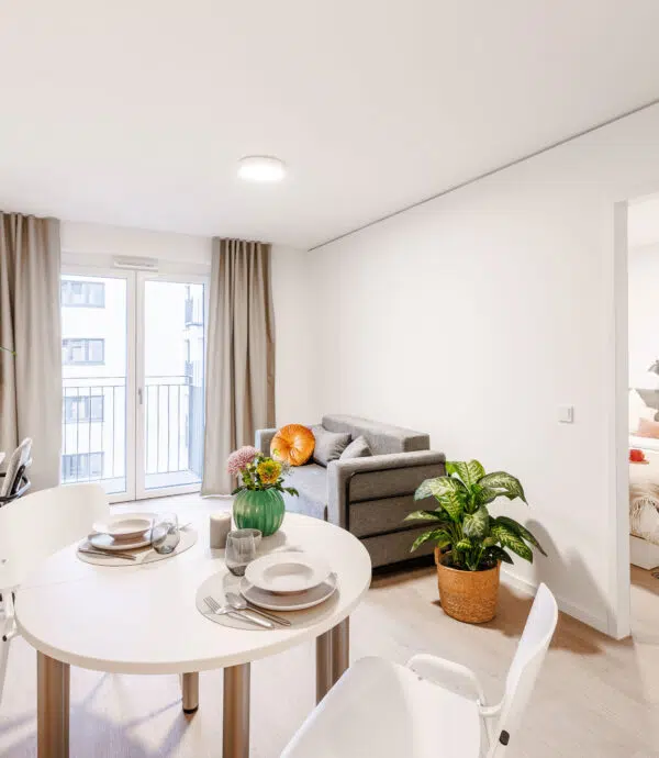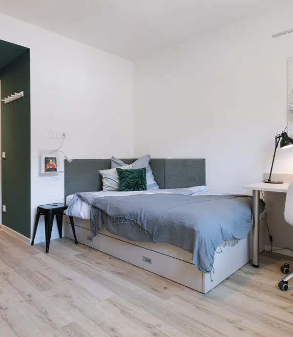 The shared apartment is perfect for people who would like to live with 2-4 people together. Enjoy your own four walls including sleeping and work area and share the kitchen and shower room with your roommates. (Sample illustration!)