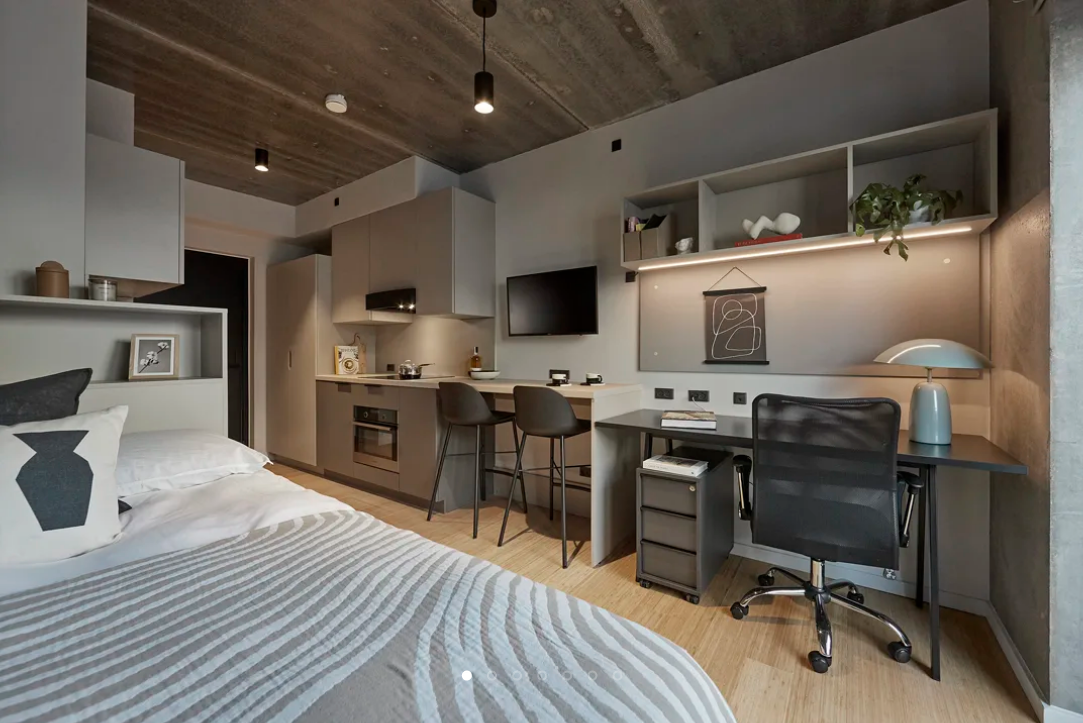 Our Deluxe Plus Studios are 28m2 (or 36m2 BBR) and located on floors 1 to 5. Our studios are ideal if you like to have your own space, kept just the way you like it. You can still use all of our common spaces & attend our events so making friends won’t be a problem. All rooms at Nido Bryggen come fully furnished with a bed, desk & chair, breakfast bar stool(s), additional seat, wardrobe, mirror, coat hooks, integrated lighting and plenty of plug sockets in convenient places.