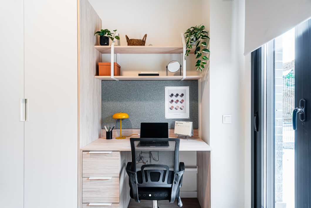 Our Deluxe Studios with Terrace are 14-24m2, with a small terrace and located on the fifth floor. Each studio apartment comes with a compact double bed, study desk & chair, wardrobe with shelving, full length mirror, ensuite bathroom and a kitchenette with storage, induction hob, combi microwave oven & fridge.