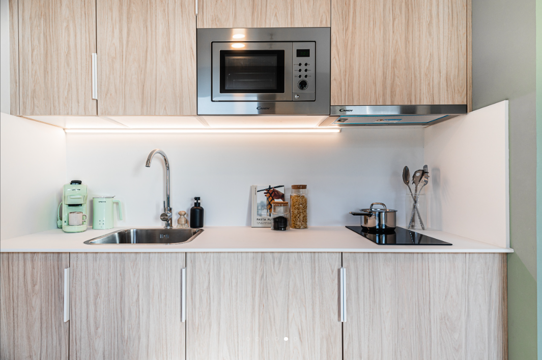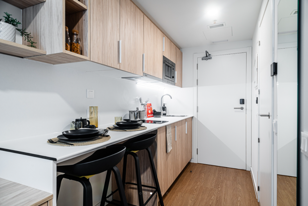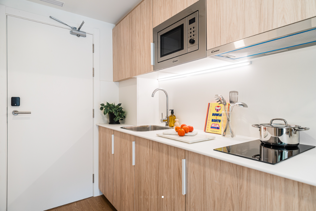 Our Classic Studios are 14-15m2 and located on the ground, first, second, third and fourth floor. Each studio apartment comes with a compact double bed, study desk & chair, wardrobe with shelving, full length mirror, ensuite bathroom and a kitchenette with storage, induction hob, combi microwave oven & fridge.
