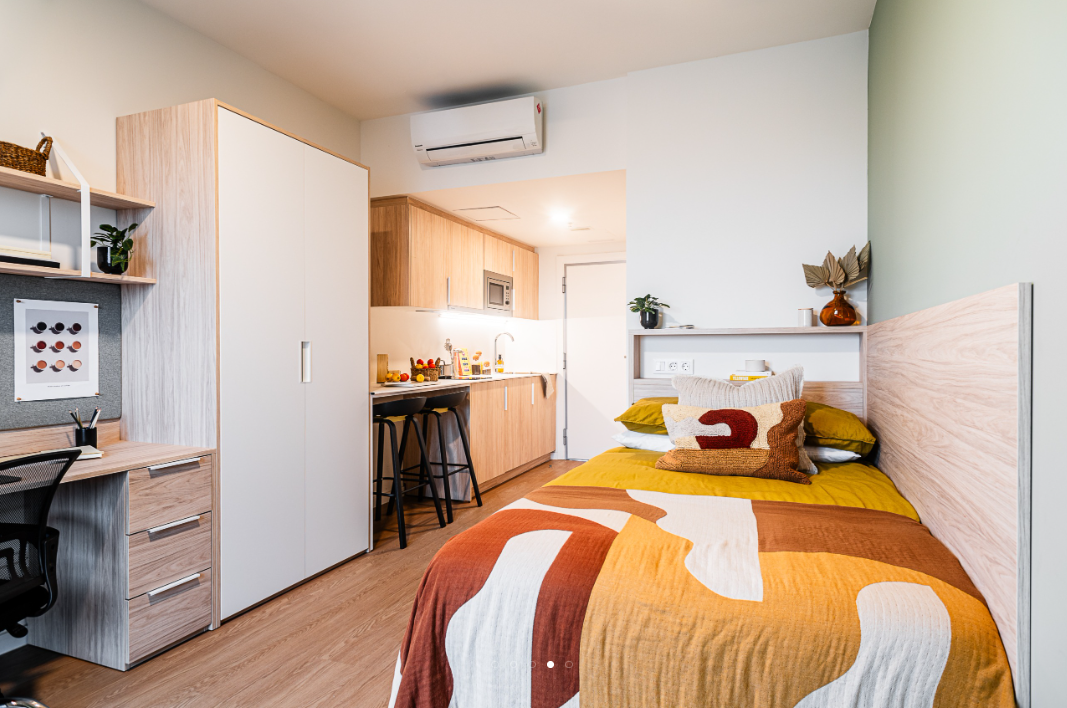 Our Deluxe Studios are 16m2 and located on the first, second, third and fourth floor. Each studio apartment comes with a compact double bed, study desk & chair, wardrobe with shelving, full length mirror, ensuite bathroom and a kitchenette with breakfast bar, storage, induction hob, combi microwave oven & fridge.