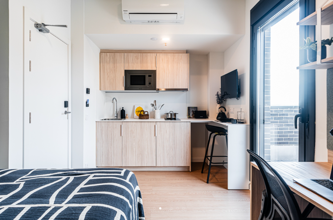 Our Premium Studios are 15.5-18m2 and located on the first, second, third and fourth floor. Each studio apartment comes with a compact double bed, study desk & chair, wardrobe with shelving, full length mirror, ensuite bathroom and a kitchenette with storage, induction hob, combi microwave oven & fridge.
