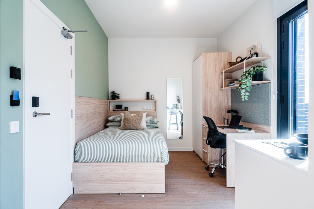 Our Classic Ensuites are located on the first, second, third & fourth floors and are 13m2. They are designed so you have the privacy of your own bedroom and ensuite bathroom while still enjoying the buzzing atmosphere of a shared living room and kitchen with 6 to 7 other people. Each ensuite comes with a compact double bed, study desk & chair, wardrobe with shelving, full length mirror and ensuite bathroom.