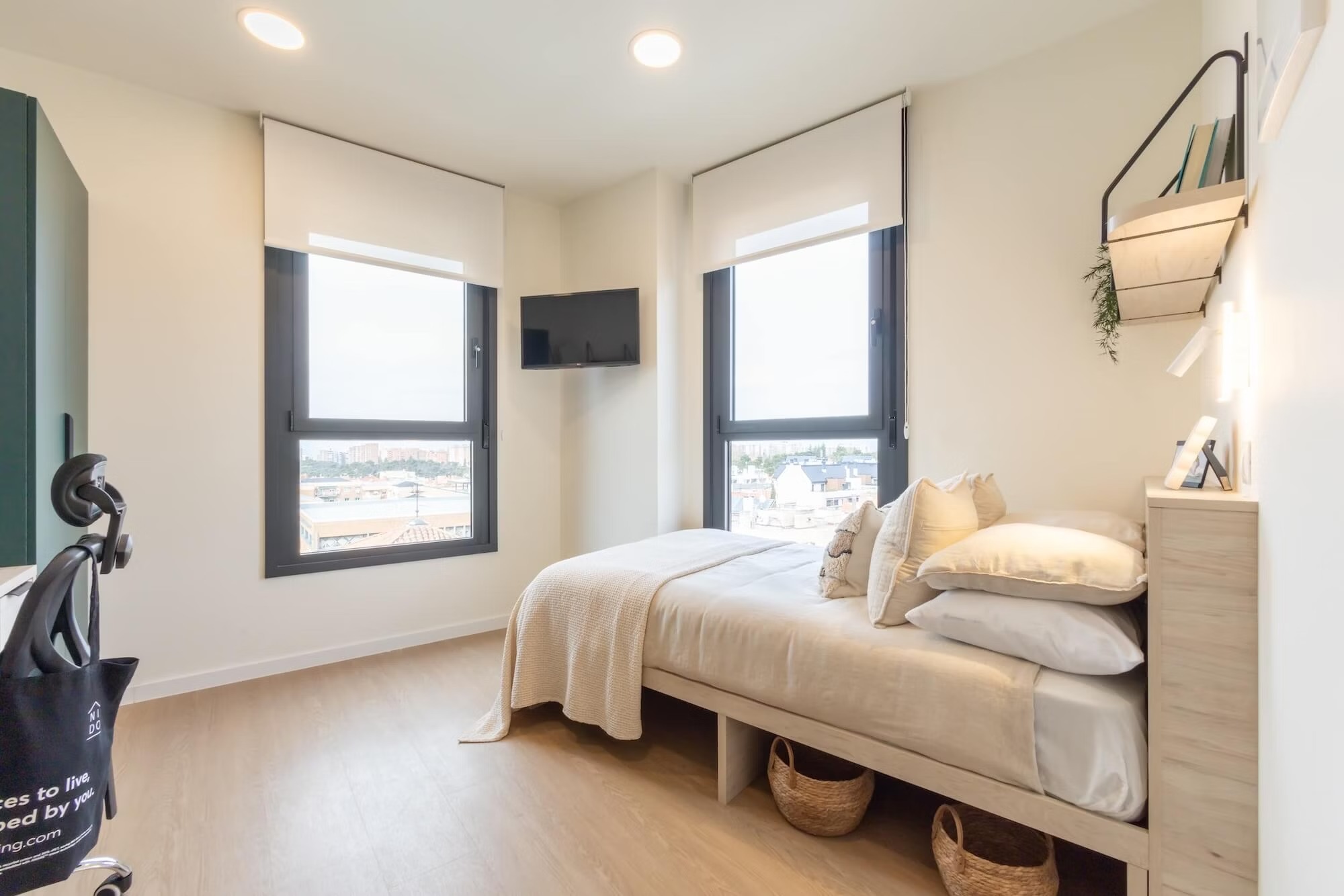 Our 1 Bed Apartments, with almost 32m2, offer a thoughtfully-designed layout with separate spaces for living and sleeping. The bedroom and private ensuite bathroom are tucked away from the kitchen, giving you a true sense of privacy. The apartment includes a comfy double bed, two study desks with chairs, two spacious wardrobes with shelving, and a full-length mirror. The living area features a fully equipped kitchen with a 2-ring induction hob, microwave combi-oven, a fridge with freezer compartment, and plenty of storage. You’ll also have your own sofa and a dining table that comfortably seats four—ideal for sharing a nice dinner with friends or simply enjoying a quiet meal at home. This apartment gives you the space and flexibility to live comfortably and host with ease.