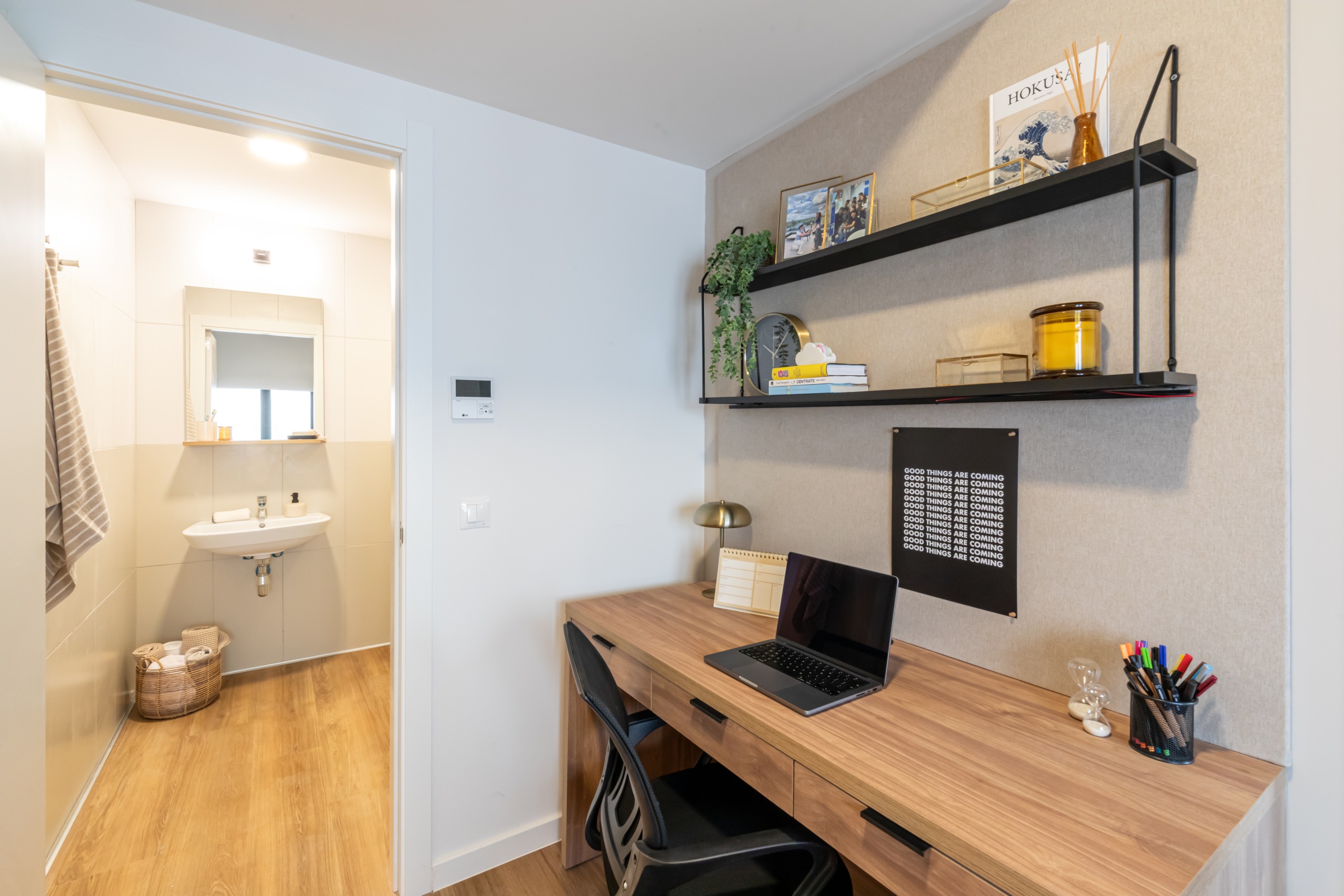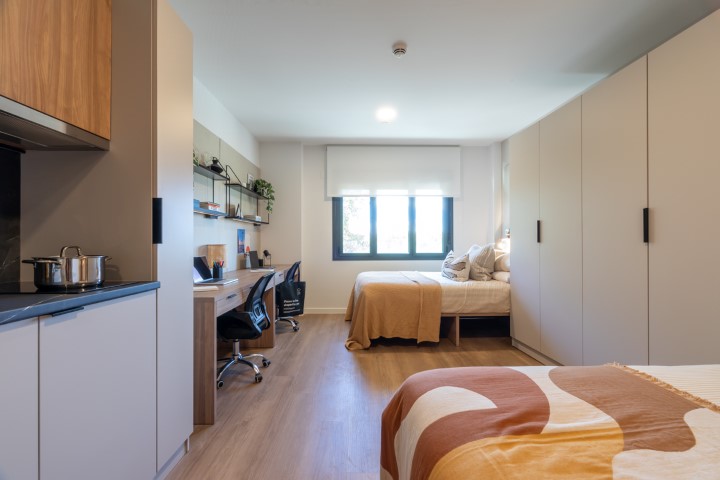 Each studio apartment comes with a 135 – 150cm compact double bed, study desk & chair, wardrobe with shelving, full length mirror, ensuite bathroom and a kitchenette with storage, induction hob, combi microwave oven, fridge and breakfast bar with stool.