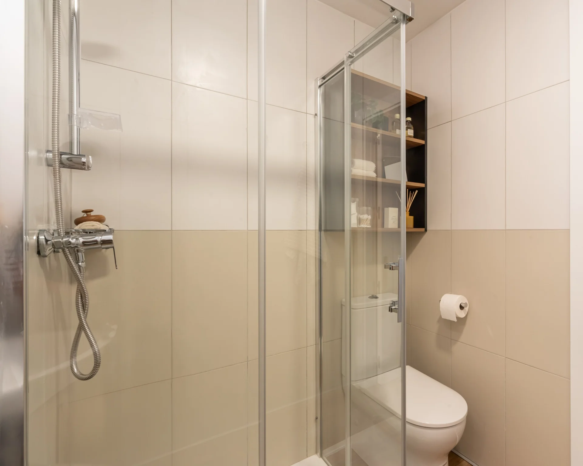 Our spacious Classic Rooms in a 2 Bed Apartment with Terrace measure 12.6 – 13.3 m2 and they are located on the eighth floor and are ideal for sharing with a friend. They are designed so you have the privacy of your own bedroom and ensuite bathroom while still enjoying the cosy atmosphere of a shared living room and kitchen with 1 other person.