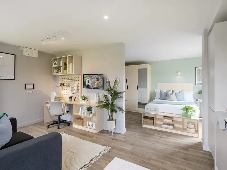 What’s in the room? Small double bed, Smart TV, Study area with desk and chair, Storage space. What’s in the shared kitchen? Fridge, Oven and microwave, Dining Table and Chairs, Cupboard space for each resident, Integrated washer-dryer, Dishwasher, Smart TV