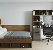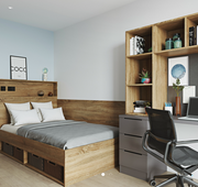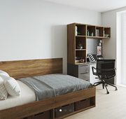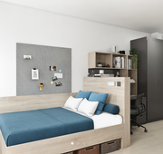 Everything you need for the best student life; a double bed, dedicated study area, storage space, and private bathroom.