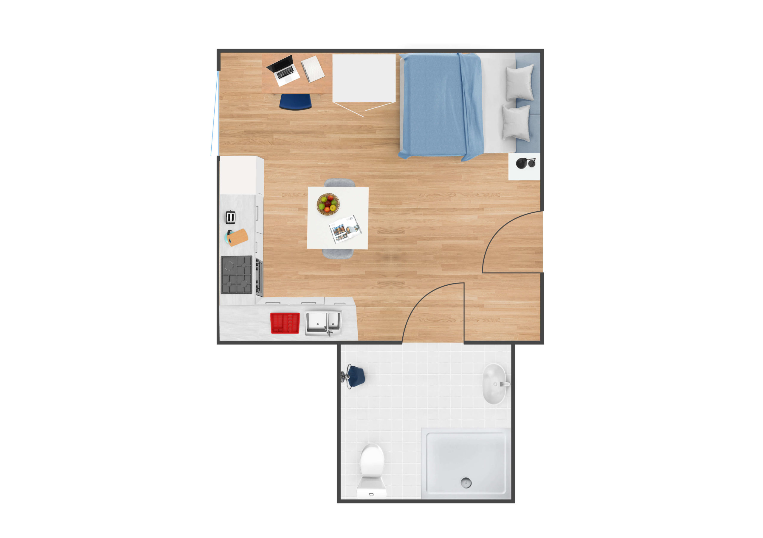 This is a modern single-occupancy 28m2 private studio apartment with: 1,500mm X 2,000mm king-size bed Fully furnished bedroom area to include wardrobe, shelving, study desk with integrated magnetic whiteboard and USB ports, study chair. Private bathroom. Fully equipped private kitchen / diner.
