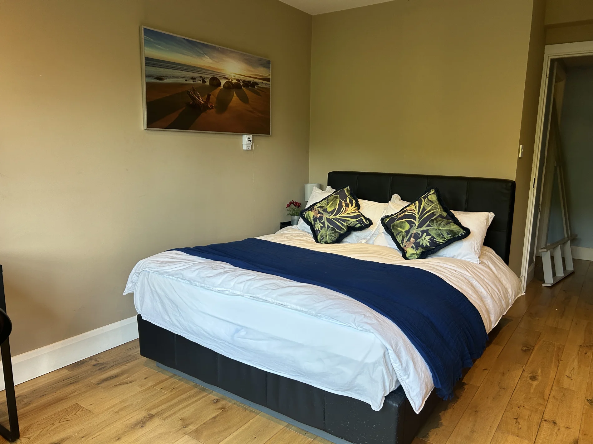 Room Size: 35 m², The studio space is fitted with Double bed, Sofa bed which can be converted to a double bed for occasional guests. The studio also has a Wardrobe and Fitted Smart Television. The kitchenette if fitted with a hob, extractor fan, sink, kitchen storage units and a Fridge Freezer. The kitchenette is fully stocked with plates, cutlery and pans for cooking.