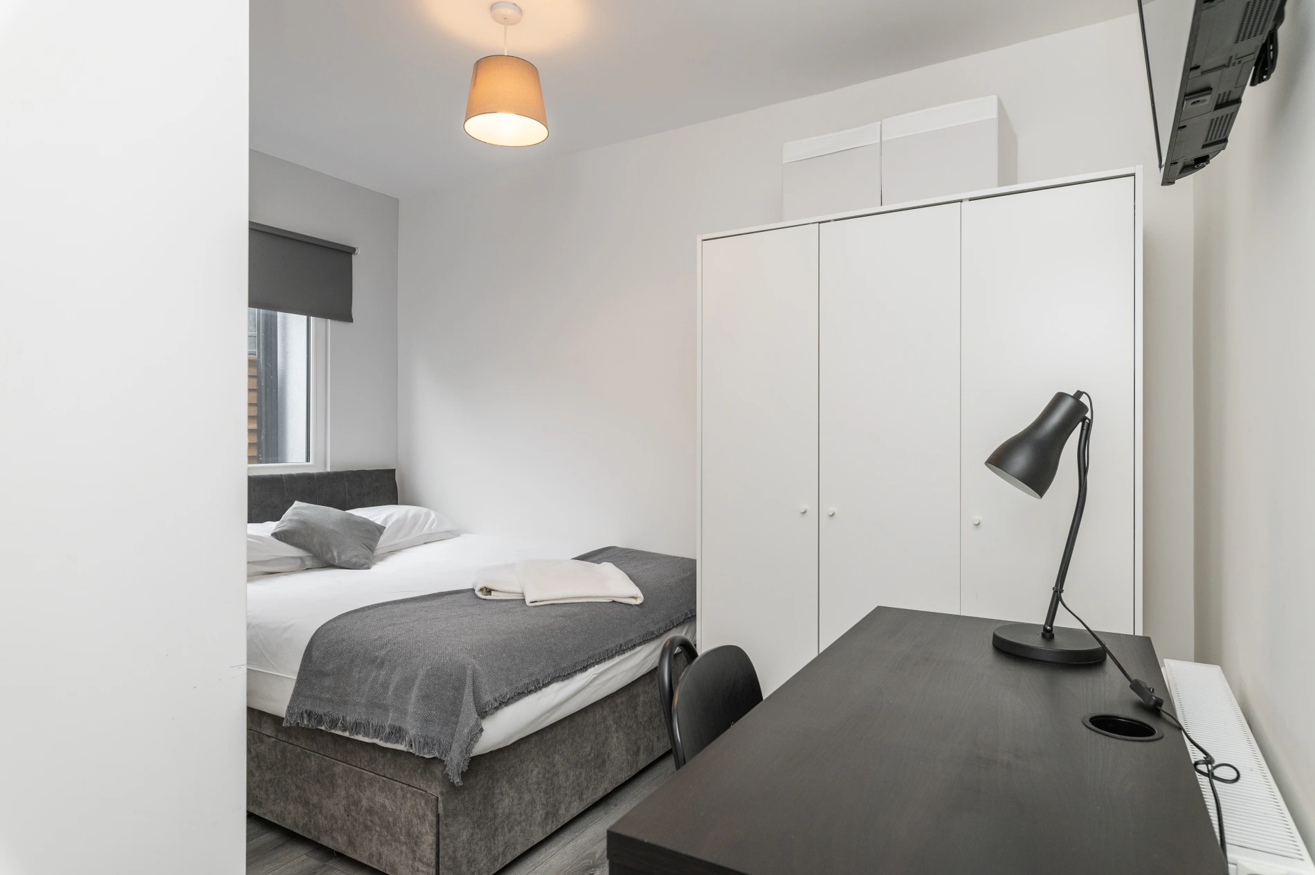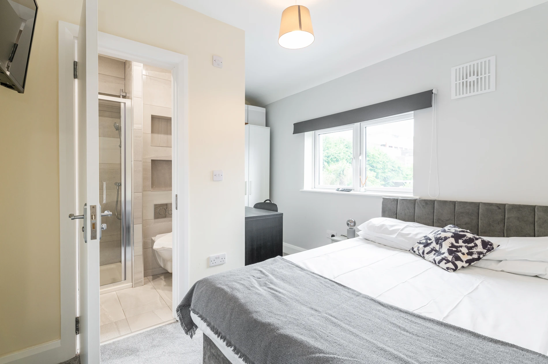 This Ensuite bedroom is on the ground floor and offers exclusive bathroom space to the tenant. The Ensuite bedroom has a double bed, wardrobe, wall-mounted TV, study table, chair, and an elegant bathroom space. There is also additional storage space for students above the wardrobe. For ventilation, there is a medium-sized window above the bed.
