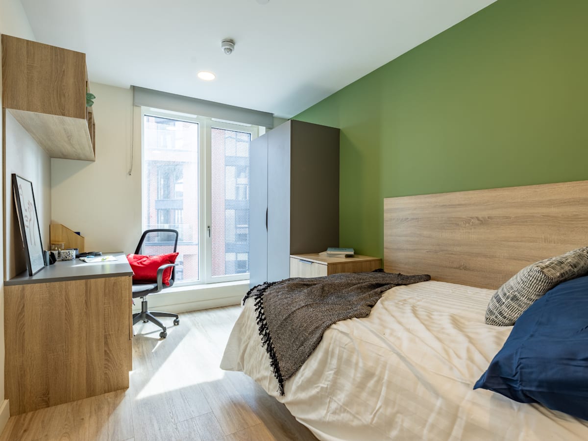 Our Standard Plus Ensuite rooms are designed to give you everything you need for student life in a cozy environment. They are 12-14.5 square meters in size and have all the things you need to balance your personal and study life. The Standard Plus Ensuite rooms are located on the 3rd, 4th, 5th, 6th, and 7th floors and each includes a compact double bed, wardrobe, desk & chair, plenty of smart storage, and ensuite bathroom. You’ll also have access to a shared lounge, kitchen, diner within your flat, so you’ll be able to socialize and keep your space exactly how you like it.