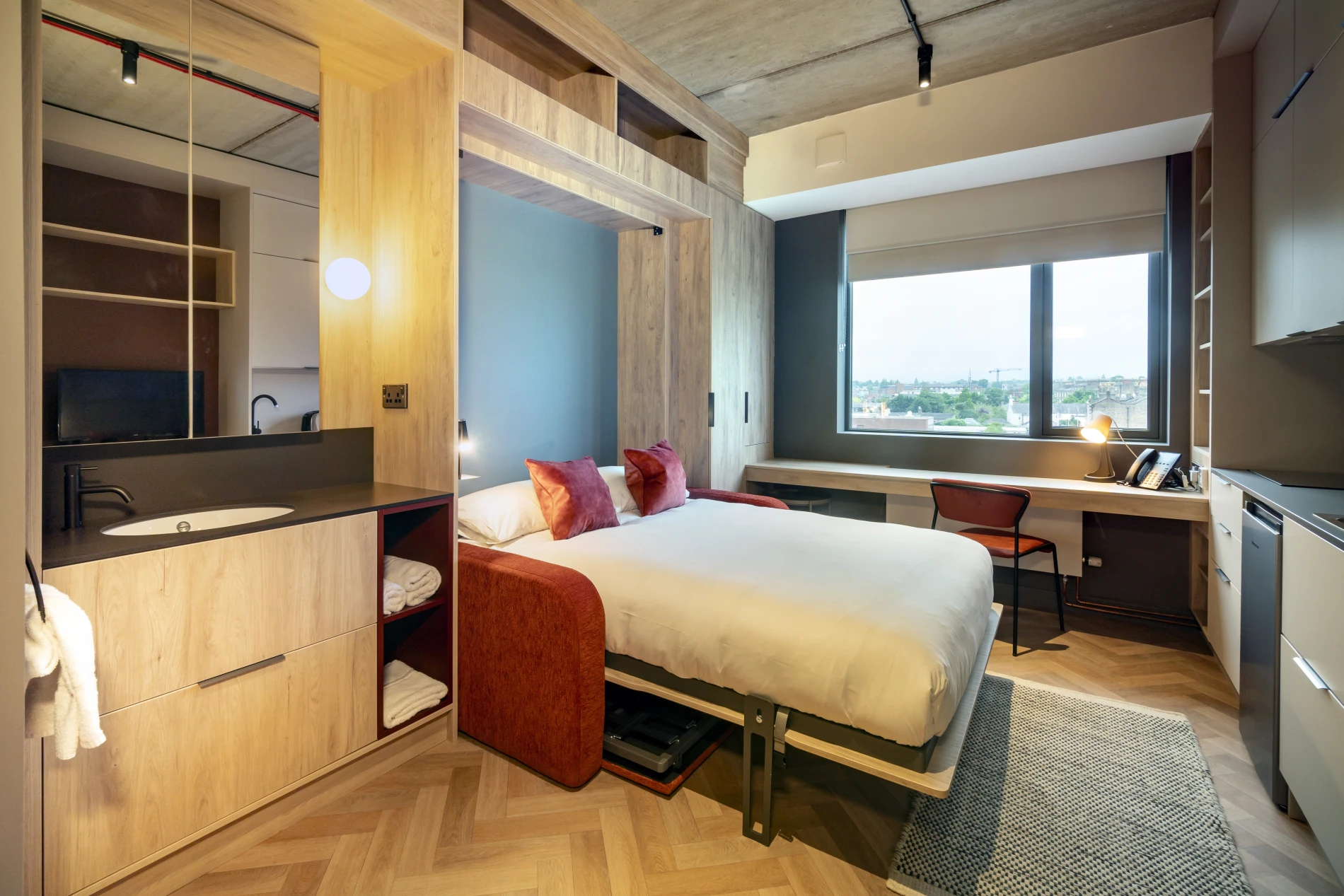 Room Size: 16.5 m², Floor: 3rd. Each studio includes a double bed and smart TV. The kitchenette comes with utensils, hob & fridge. Full en-suite, WFH desk, ample storage, valuables safe.