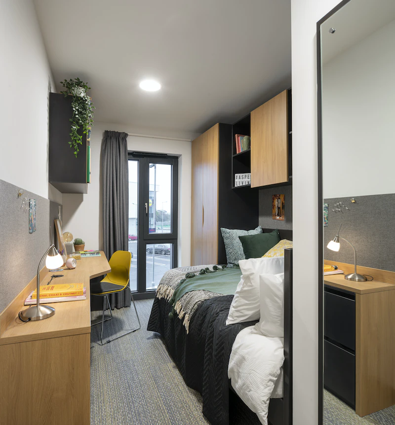 Prepare for amazing Insta-worthy views of Dublin in our 12m2 gold en suite room, the highest rooms with the best views in the house! See the sea and the mountains at the same time and relax in your super comfy room with everything you need for the perfect home away from home. Have a nice hot power shower and snuggle into your comfy bed after a long day of uni and unwind in our fabulous communal spaces. Feeling hungry? Rustle up something scrumptious in the shared kitchen with an oven, hobs, a fridge freezer and a dining table. The communal space has soft chairs and a TV, perfect for when it’s time to chill out. With all-inclusive bills and fast WiFi, students can crack on with work at their very own study desk. There’s secure door entry to ensure safety and security as well as access to all of Aspens amazing communal spaces, so get ready to make some new mates!